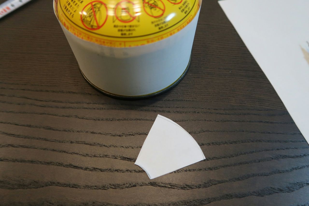 缶の側面と上の屋根の部分の長さを図って、紙を切りましょう。実測より5㎜くらい大きく作ったほうが良いかもです。