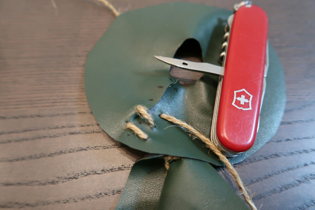 あとは型紙となる紙と、穴空け用のキリですね。僕はビクトリノックスのリーマーを使いました。