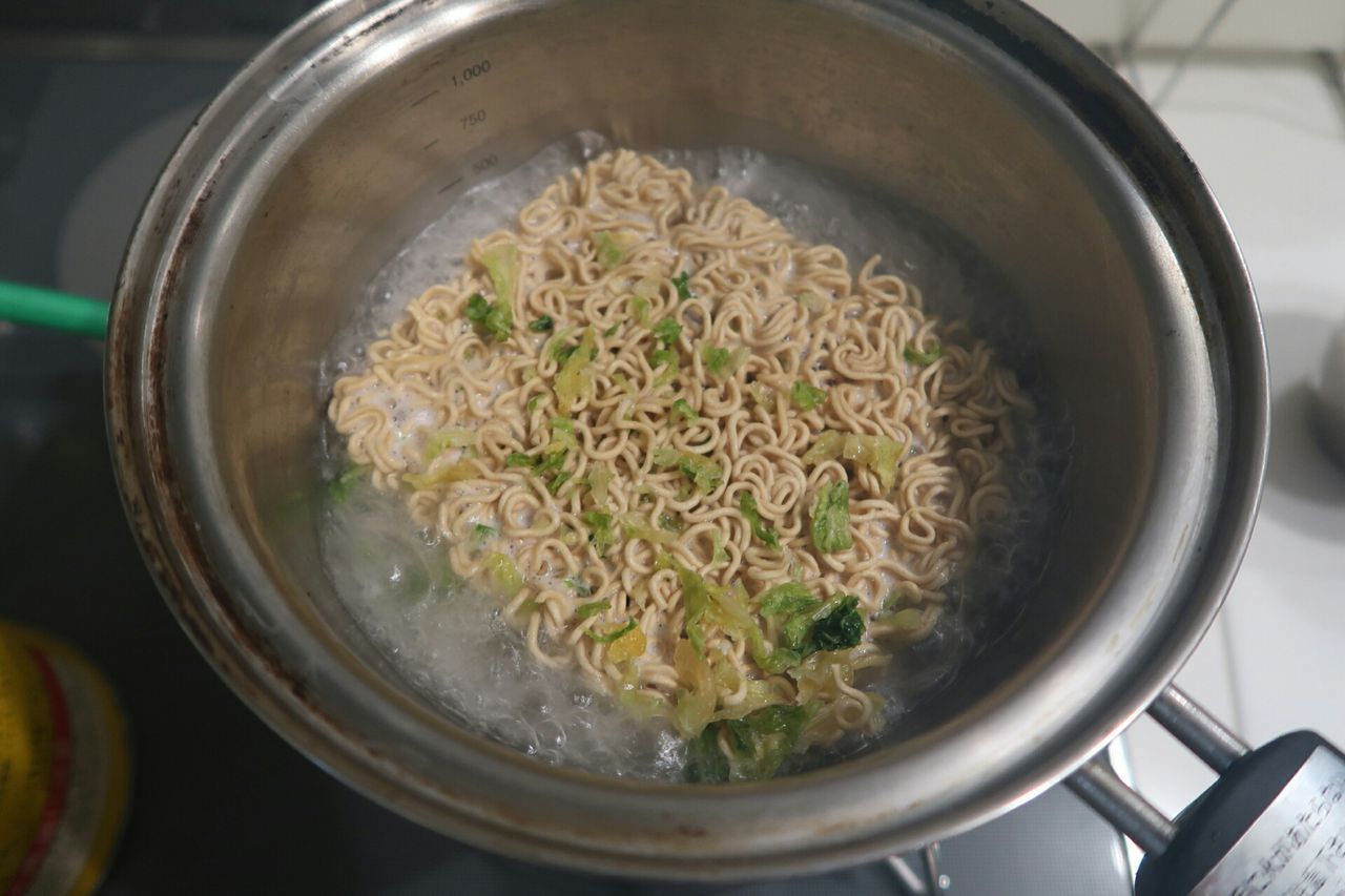 そしてお湯を沸かして、沸騰してきたら麺をドボンです。かやくも一緒に入ってます。