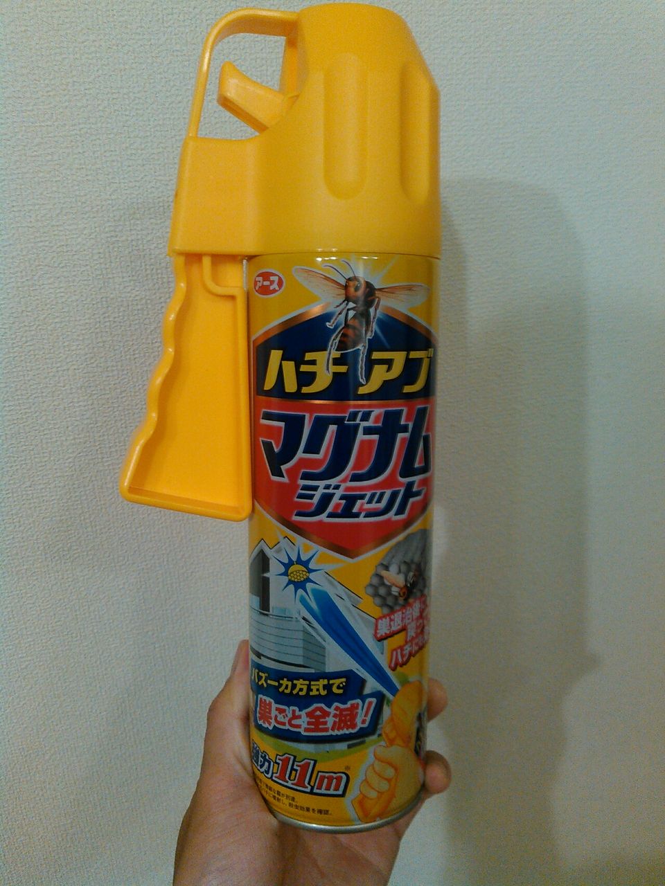 射程距離が11mとありますが、「無風状態で微細な霧が到達」とあるので、確実な射程距離は5mくらいでしょう。あと缶には思いっきり「スズメバチ」のイラストが書いてありますが、これはスズメバチ用ではありません。殺せるのはアシナガバチまでです。スズメバチは生命力と攻撃力がすごいので「スズメバチ専用」のスプレーを使いましょう。