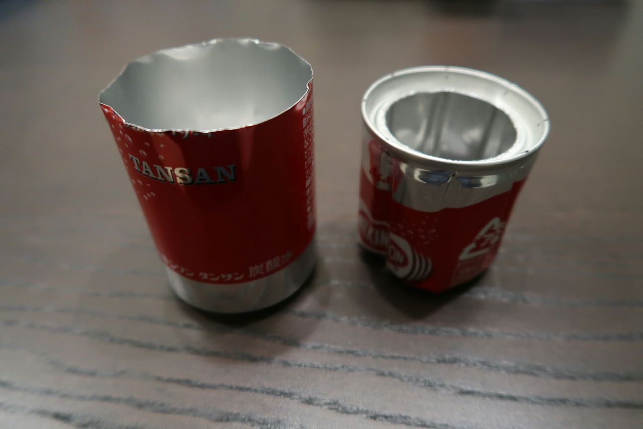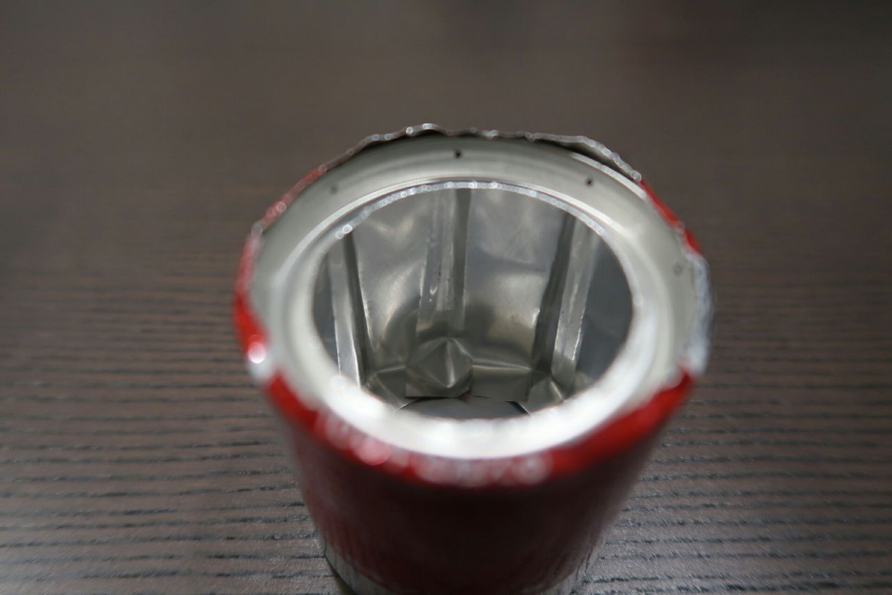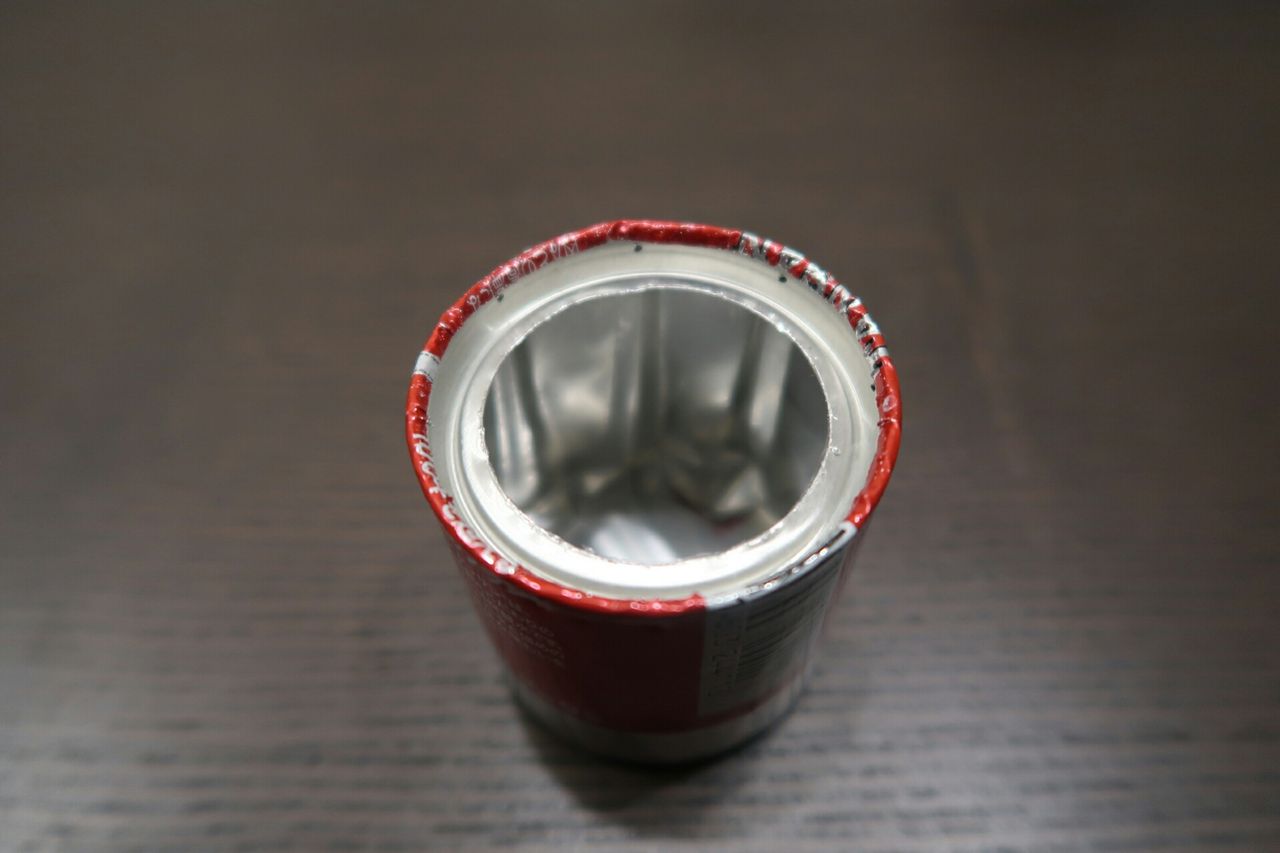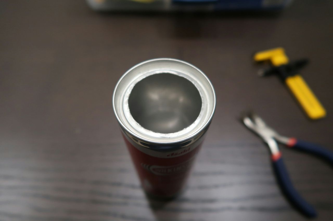 フチの形状がこのようなくびれのあるタイプ(炭酸水やエナジードリンク系の缶)が良いです。ただし、レッドブルは缶が柔らかすぎて加工が難しい気がするので、個人的にはおすすめしません。