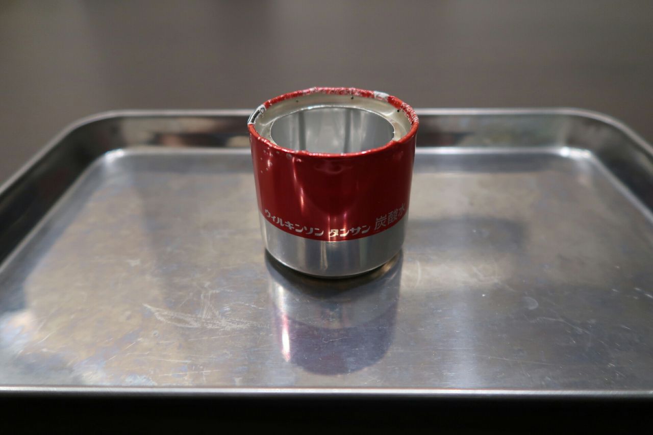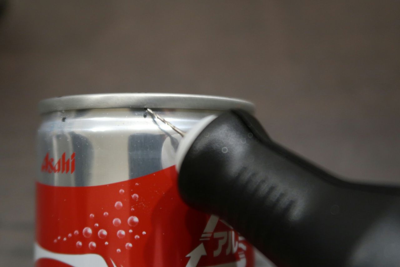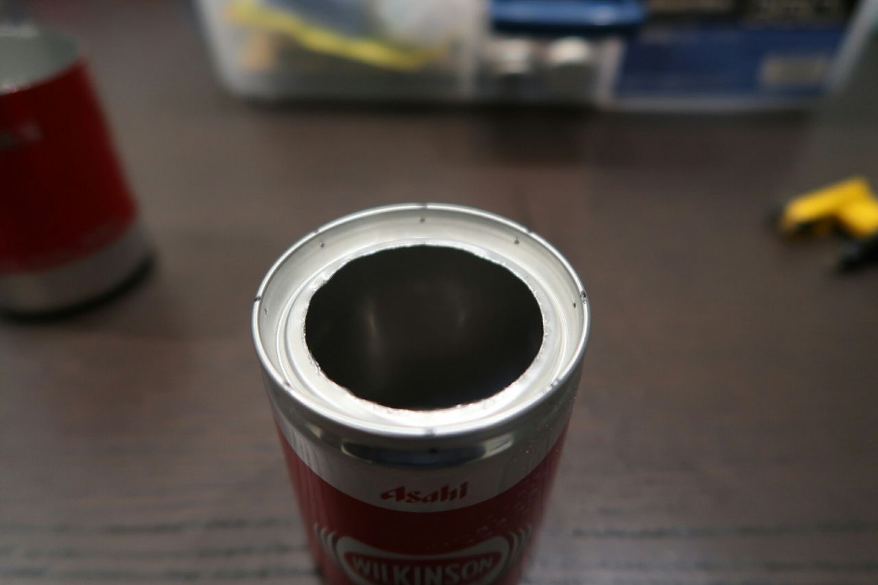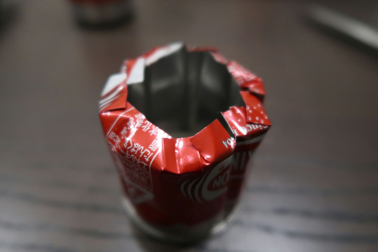 フチの形状がこのようなくびれのあるタイプ(炭酸水やエナジードリンク系の缶)が良いです。ただし、レッドブルは缶が柔らかすぎて加工が難しい気がするので、個人的にはおすすめしません。