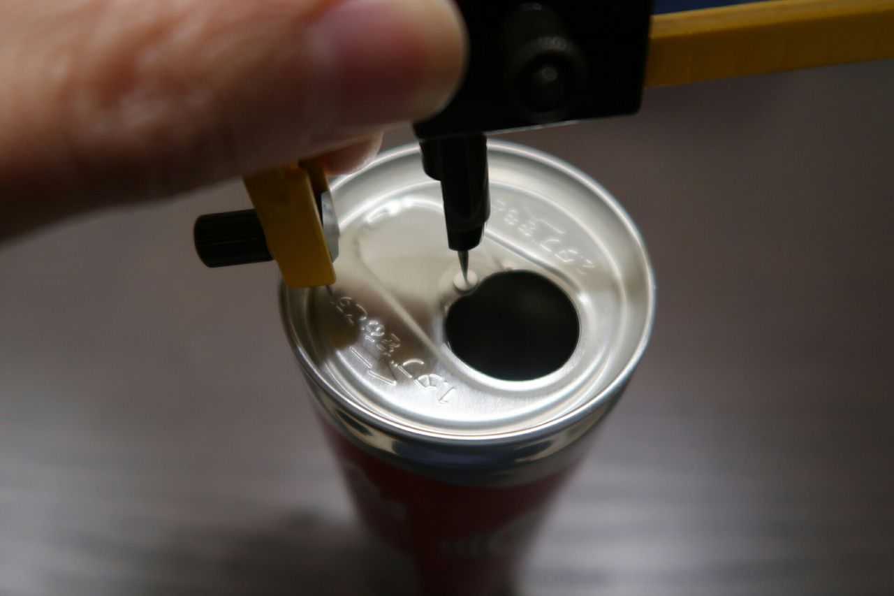 次は、缶を半分にカットします。マジックでしるしをつけましょう。僕は目算でしるしをつけてます。どうせ後でまた切るので、ガタガタの切り口でも問題ないです。