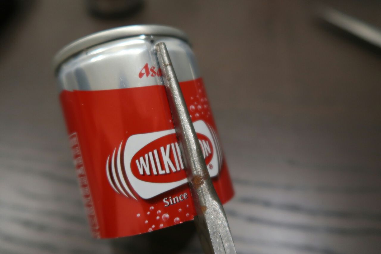 個人的には加工しやすさ、内容物のコゲが出来ないという点で「ウィルキンソン 炭酸水」がトルネード式アルコールストーブづくりに最も適した缶だと思います。