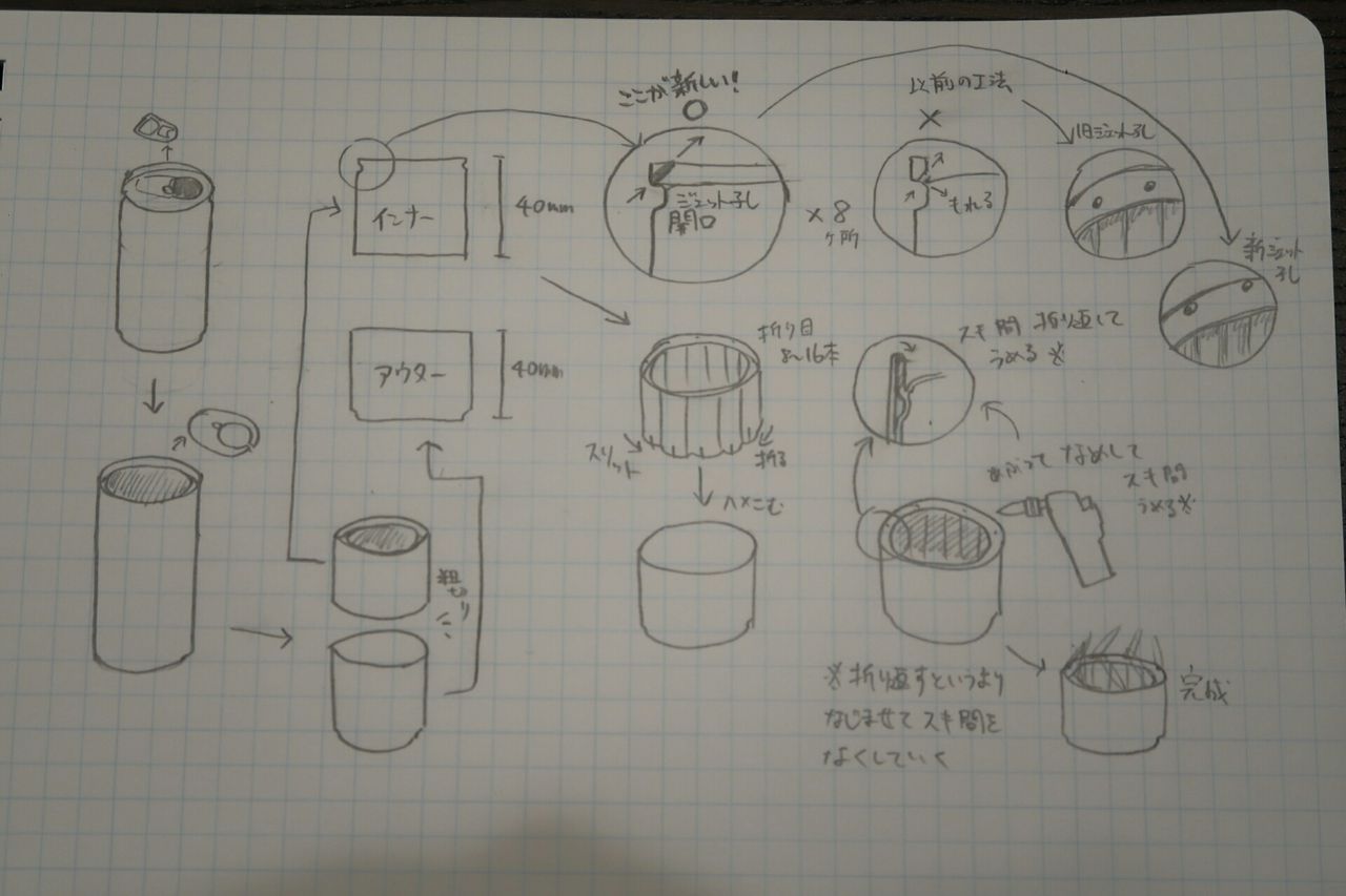 - 高さは40㎜程度で、副室壁の折り目は浅めにして、気化アルコールの圧力を高めること。