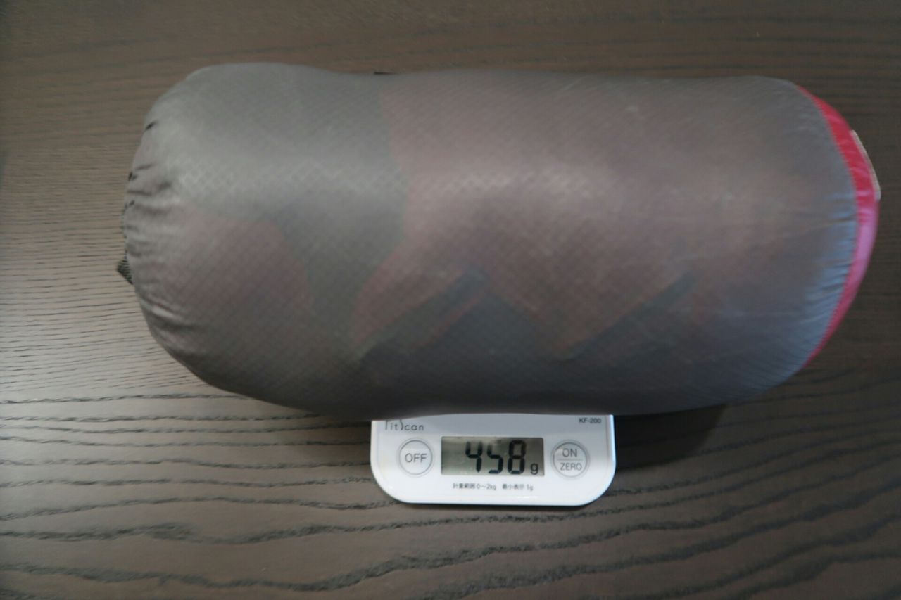 重量は実測値で458g(スタッフバッグ込)です。羽毛量は180gです。イスカのエア450が904gですので、3シーズン用シュラフの約半分です。これは大きな違いです。