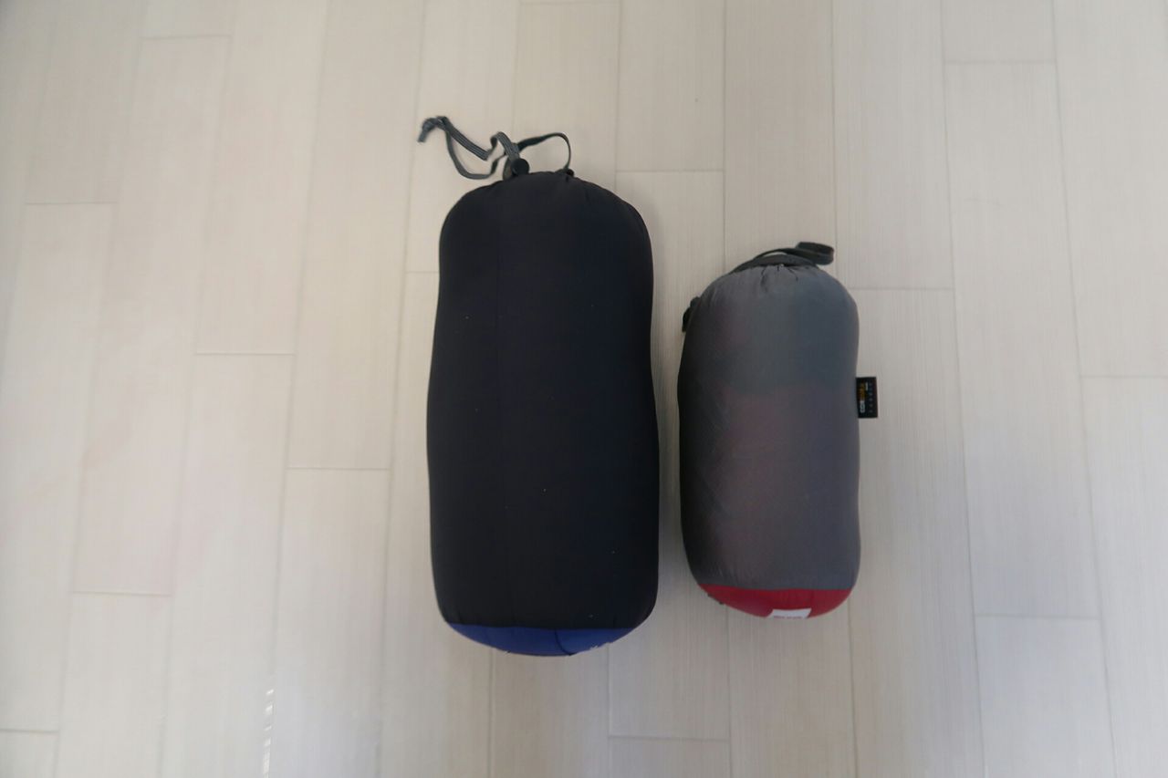 同じくイスカの3シーズン用シュラフ エア450と収納サイズを比べてみました。3シーズン用シュラフは2リットルペットボトルよりやや大きいくらいです。