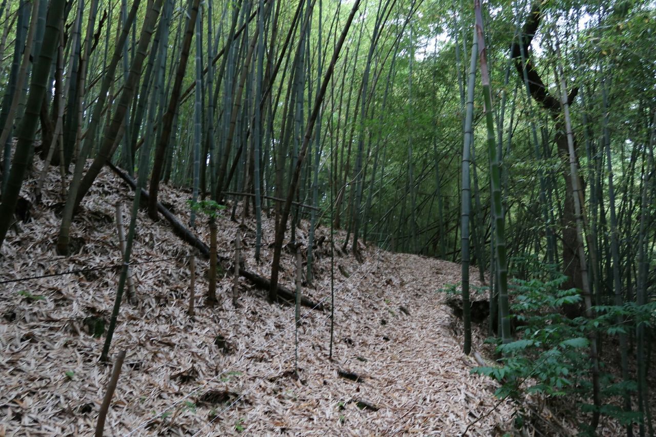 すぐに竹林が現れる。登山道にあるのは珍しい気がする。地面に落ちた竹の葉は滑りやすそうなので注意が必要だ。