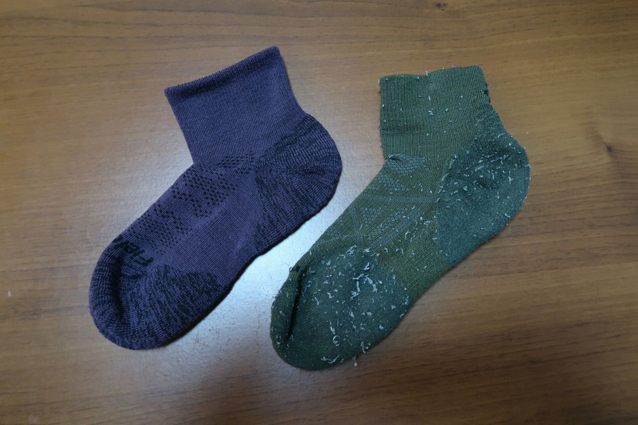 左:ワークマン。右:スマートウールPhDアウトドアライト。スマートウールのほうは1年くらい履いているので毛玉はあるが、素人目にはほとんど違いがわからない。ワークマンのほうが少し伸縮性が高い気がする。