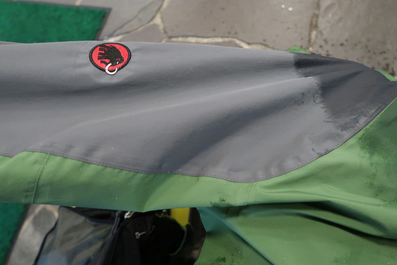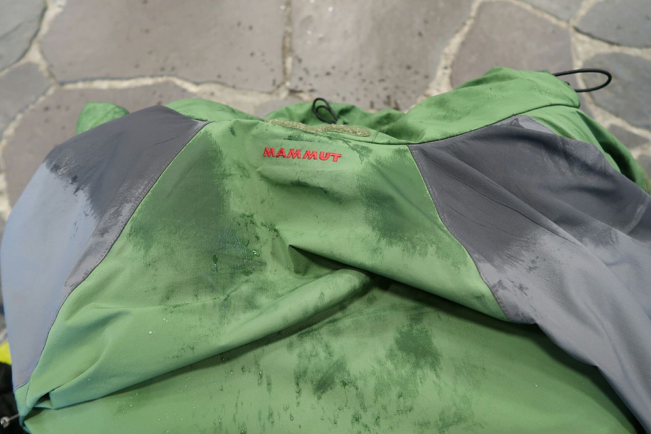 結論から言おう、めっちゃ快適。撥水性は見ての通りで、そのせいで透湿性もかなり高くなっていると感じた。そもそもGORE-TEX®の雨具の透湿性が損なわれる一番の理由は表地の撥水力が失われて、表地に水の膜が張るからだ。水の膜ができると透湿が起こらなくなる。