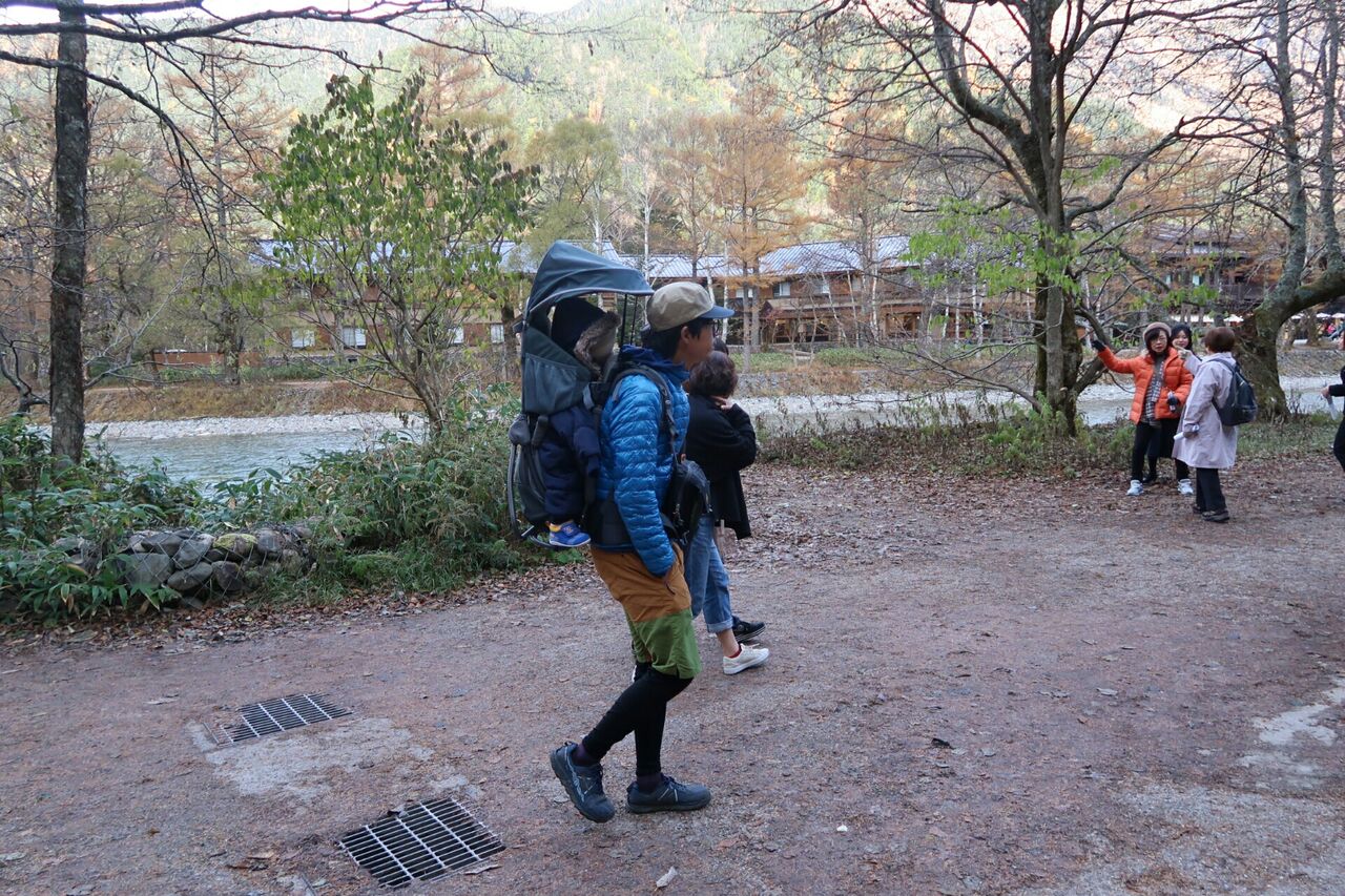 この時期の上高地の気温は午前中で4℃前後。日陰だとかなり寒い。ただ、これだけ着せたら赤ん坊は寒くなさそうだ。ちなみに日が出てくるとかなり暖かくなるので、着せすぎても汗をかく可能性があるので要注意。
