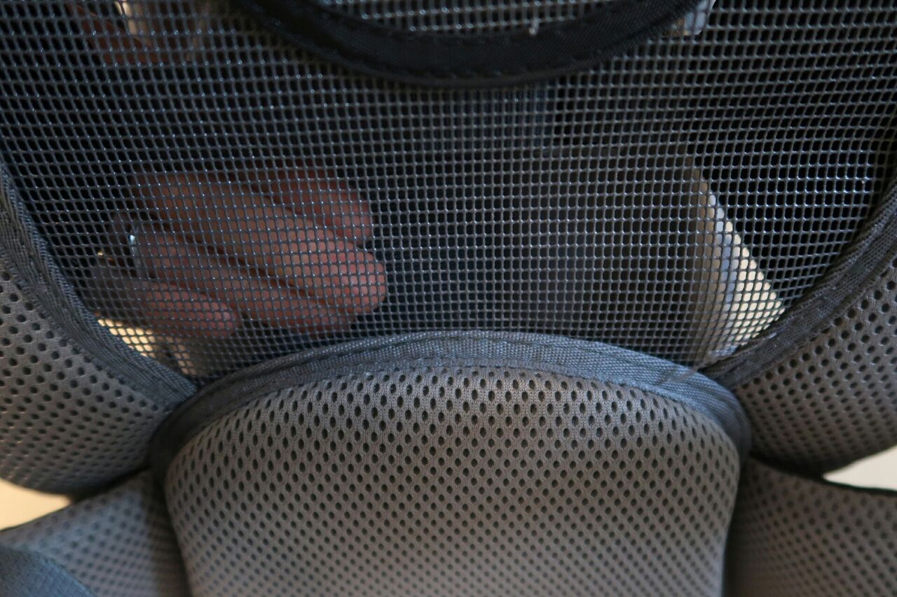 背面は半分くらいがメッシュ構造になっており、隙間があるので通気性がかなりよい。ドイターザックのエアコンフォートシステムを受け継いでいる。子どもに親の背中の汗や熱がダイレクトにいかないのも良い。