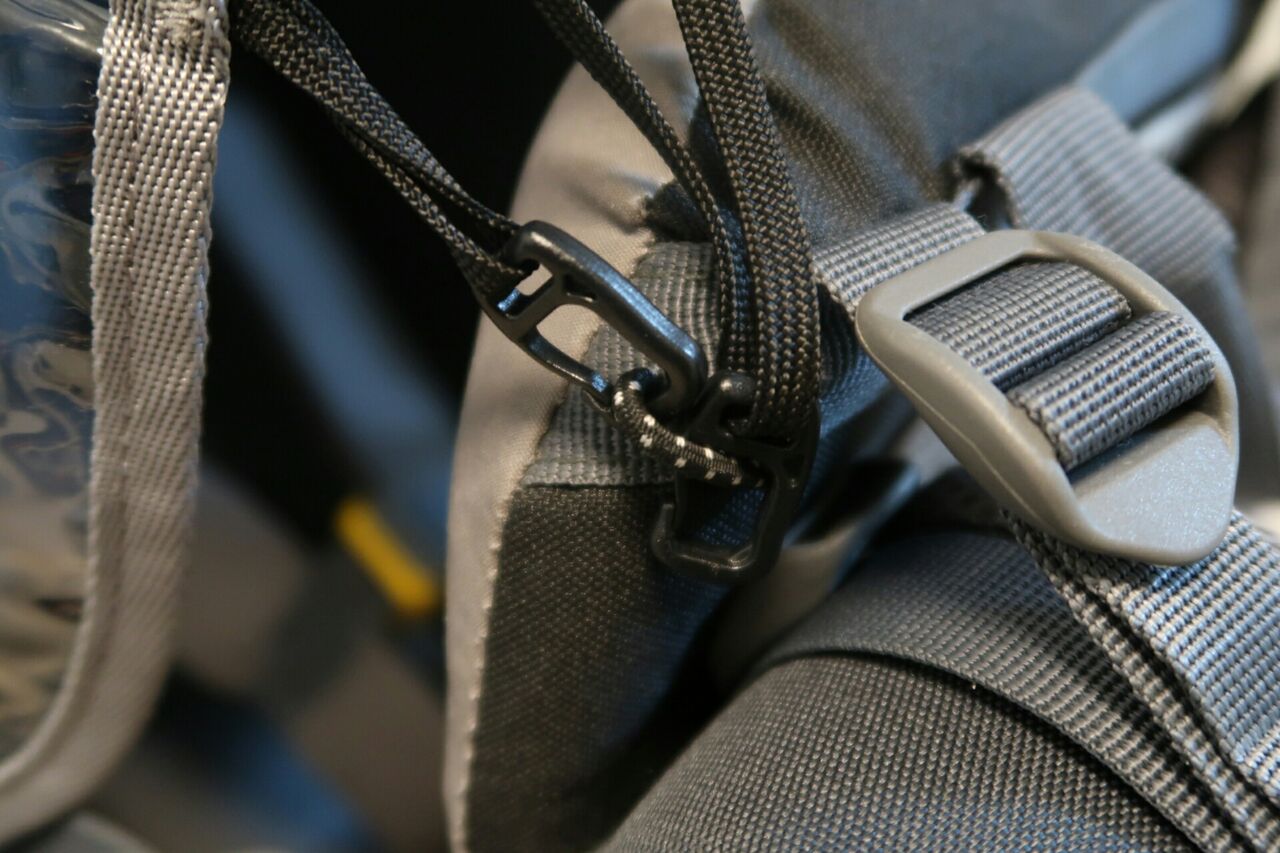 レインカバー後面のジョイント。ここはなぜか紐がゴムではないので取り付けにくい。なので小さいS字カラビナを咬ませてみた。
