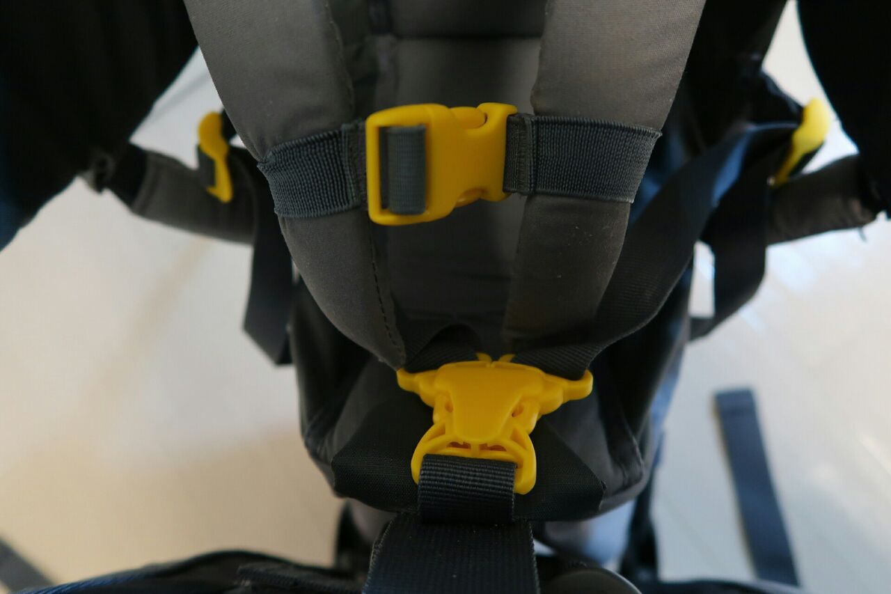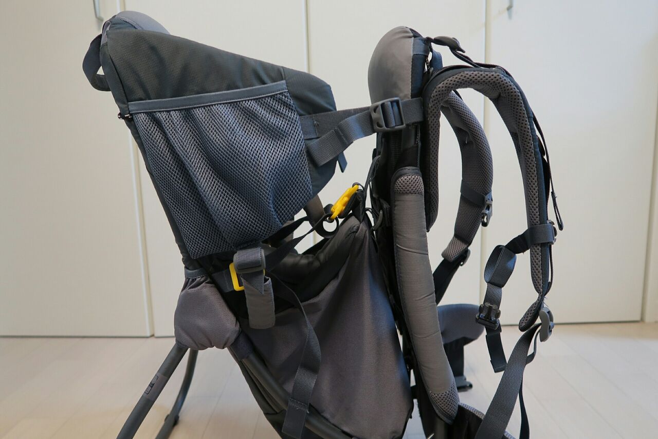 まずはベビーキャリーの全体像。ドイターザックお馴染みの、太いハーネスが特徴。見るからに背負い心地が良さそうで、実際に背負いやすい。