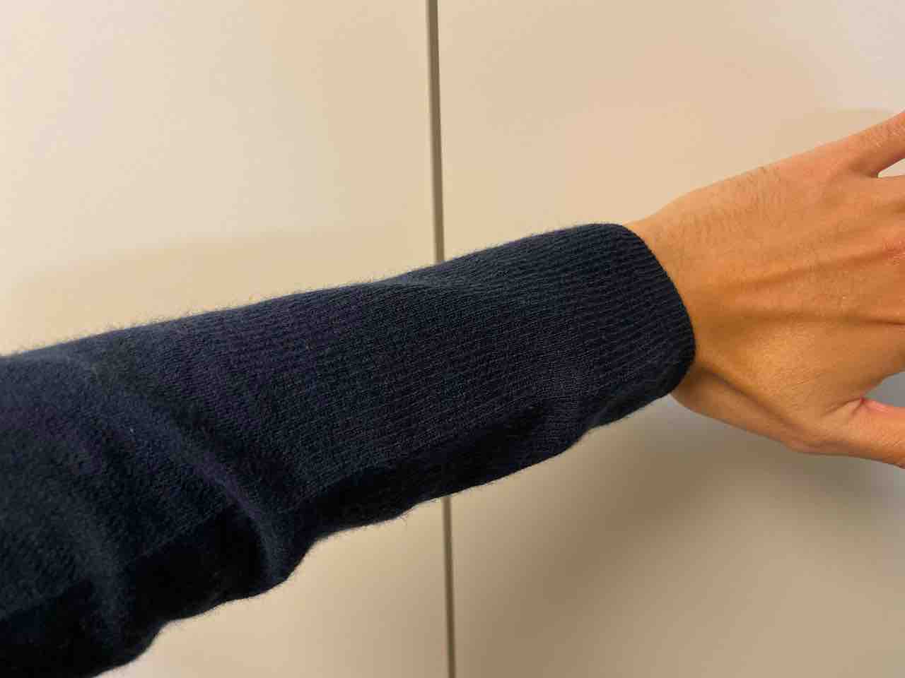 同じく肘も色が違う。ここは耐久性を高めるためにリブ状の織り方をしているので凹凸がある。芸が細かい…。