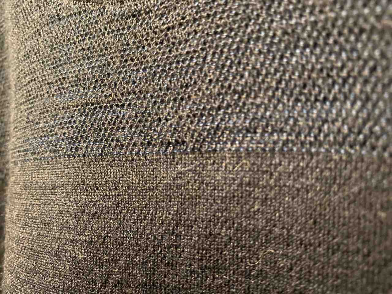 上がベンチレーションゾーンなのだが、織り方が立体的になっているのがお分かりだろうか?網目状になっていて、空間ができている。流行りのアミアミシャツのようでもある。これが通気と保温を両立させる特殊な3Dニットというわけだ。