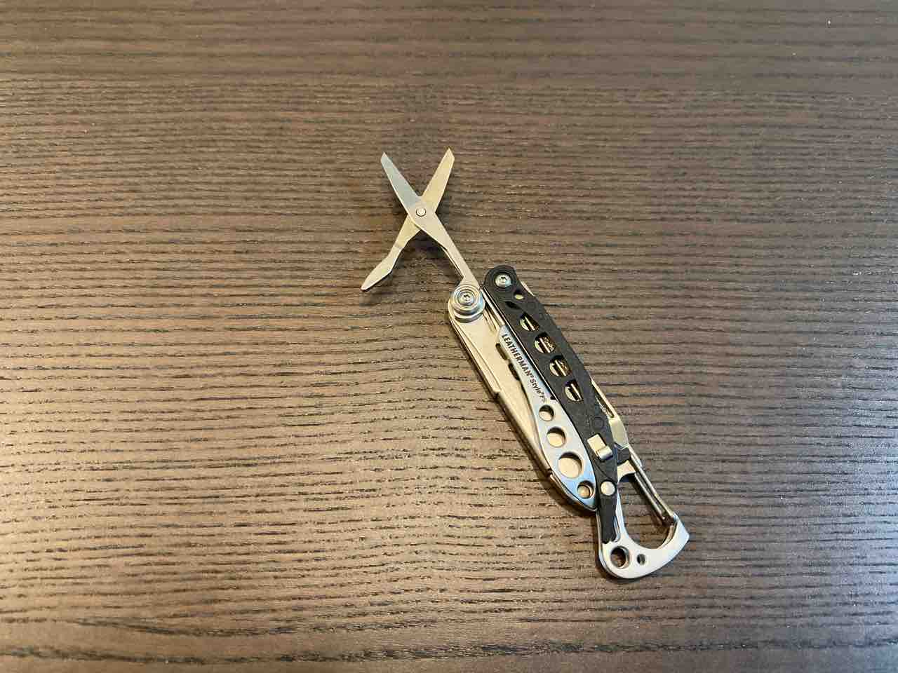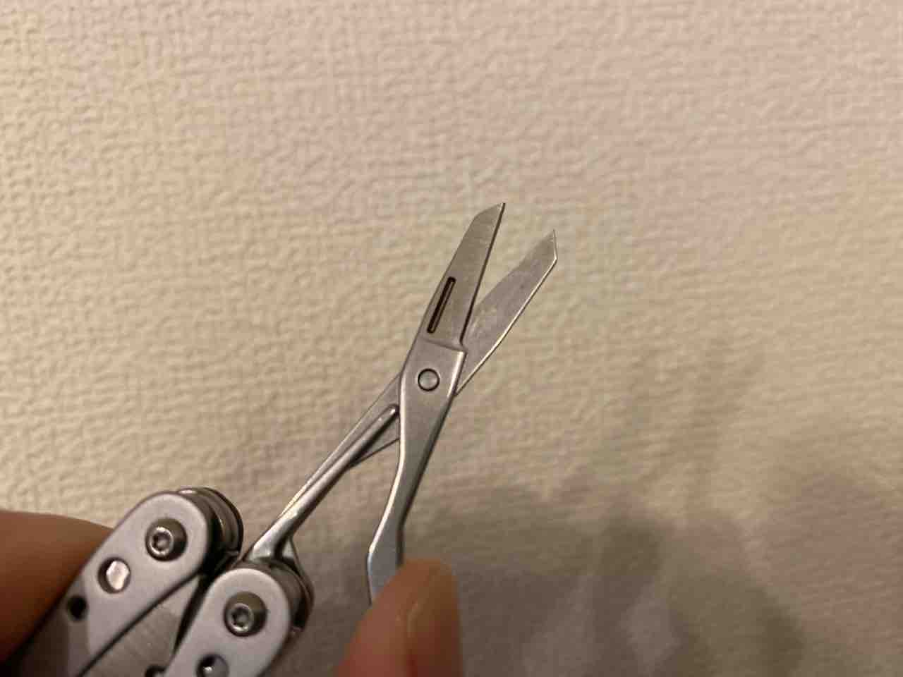 ハサミがあるとなかなか便利。実はナイフより全然活躍する。テント等のリペアテープ、ダクトテープを切ったりするのに重宝する。ナイフだと紙系のものを切るのには全く不向きなのでハサミの方が使える。