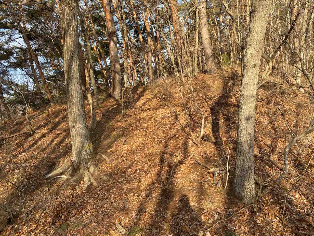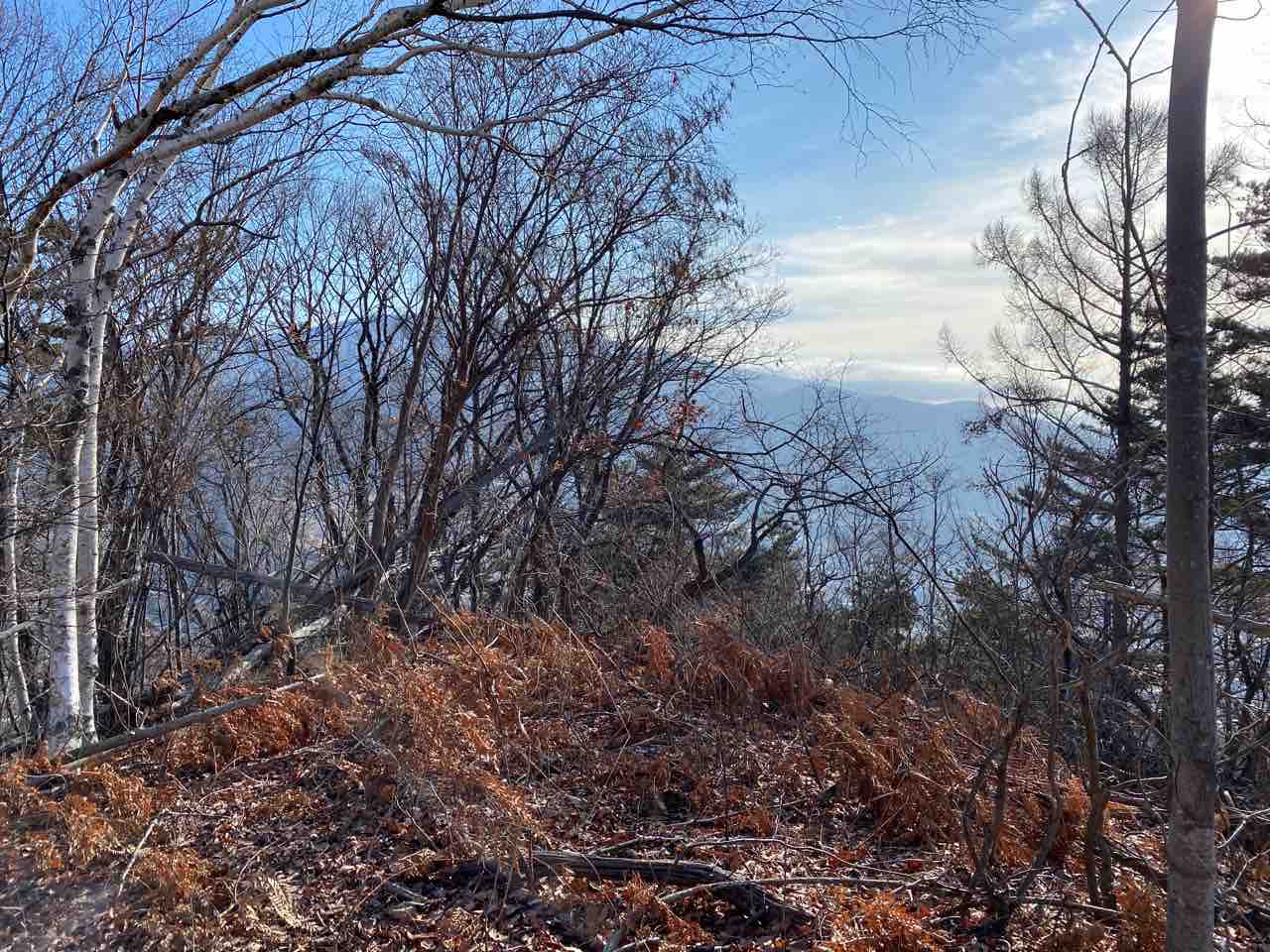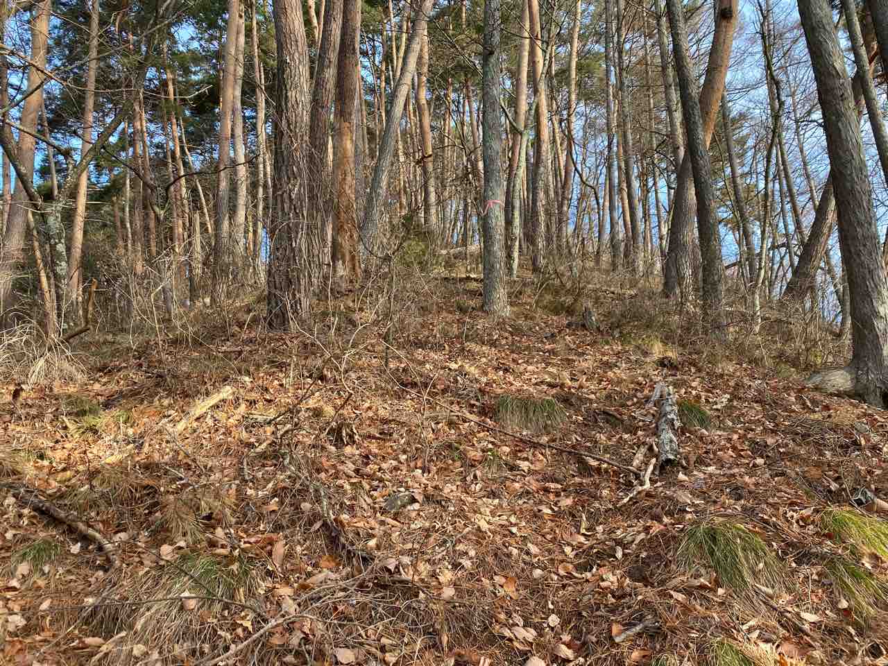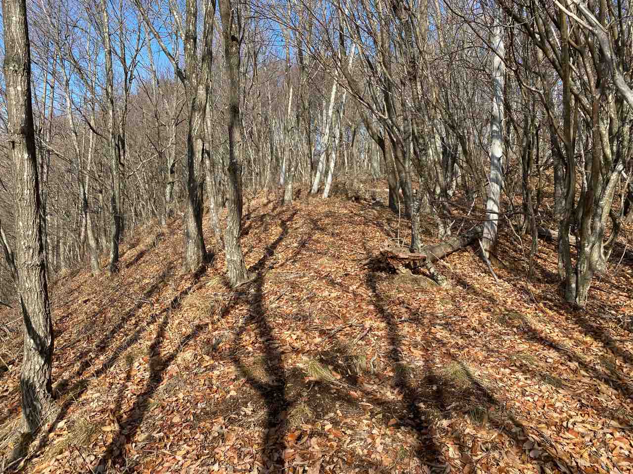 尾根筋を行くのがセオリーだが、斜度がきつく、落ち葉が多いので一筋縄ではいかなかった。シカの獣道を辿りながら、時折直登し、尾根の上の平坦部を目指す。シカ先輩、あざす!
