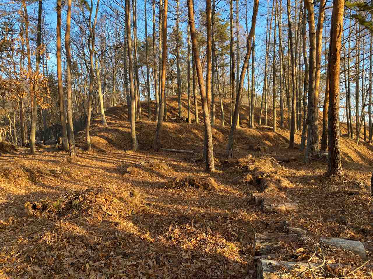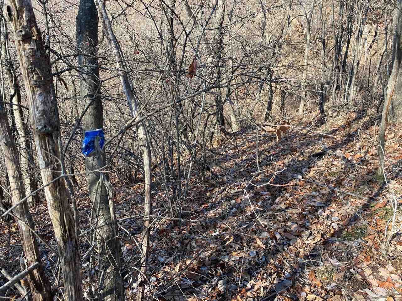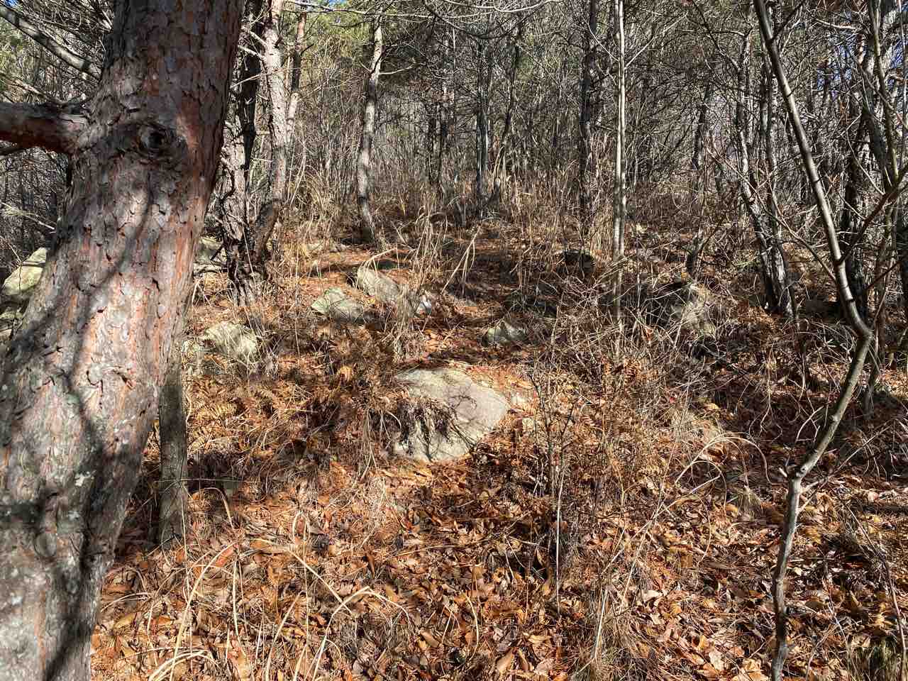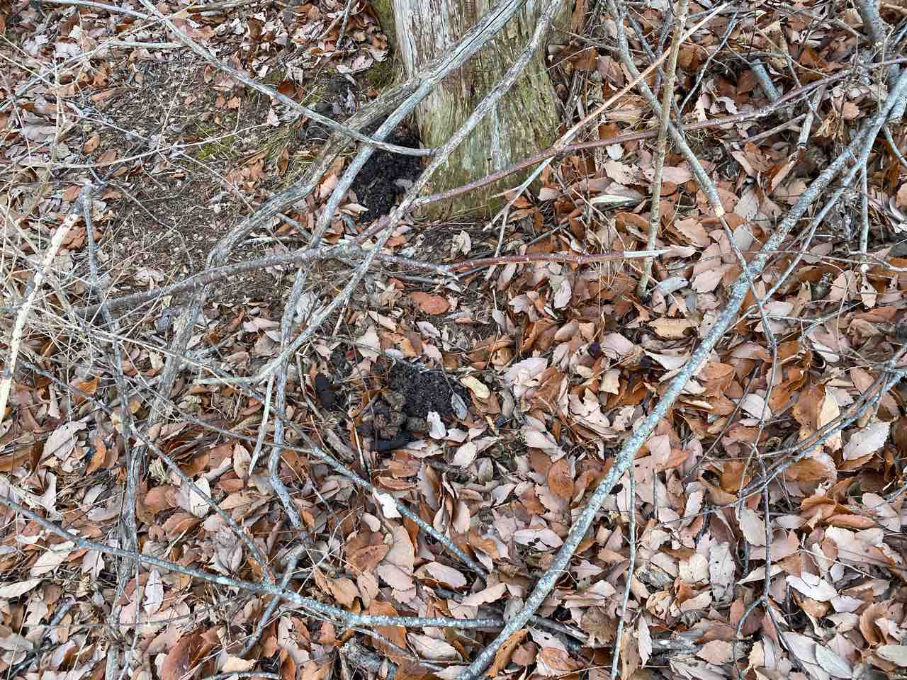 尾根筋を行くのがセオリーだが、斜度がきつく、落ち葉が多いので一筋縄ではいかなかった。シカの獣道を辿りながら、時折直登し、尾根の上の平坦部を目指す。シカ先輩、あざす!