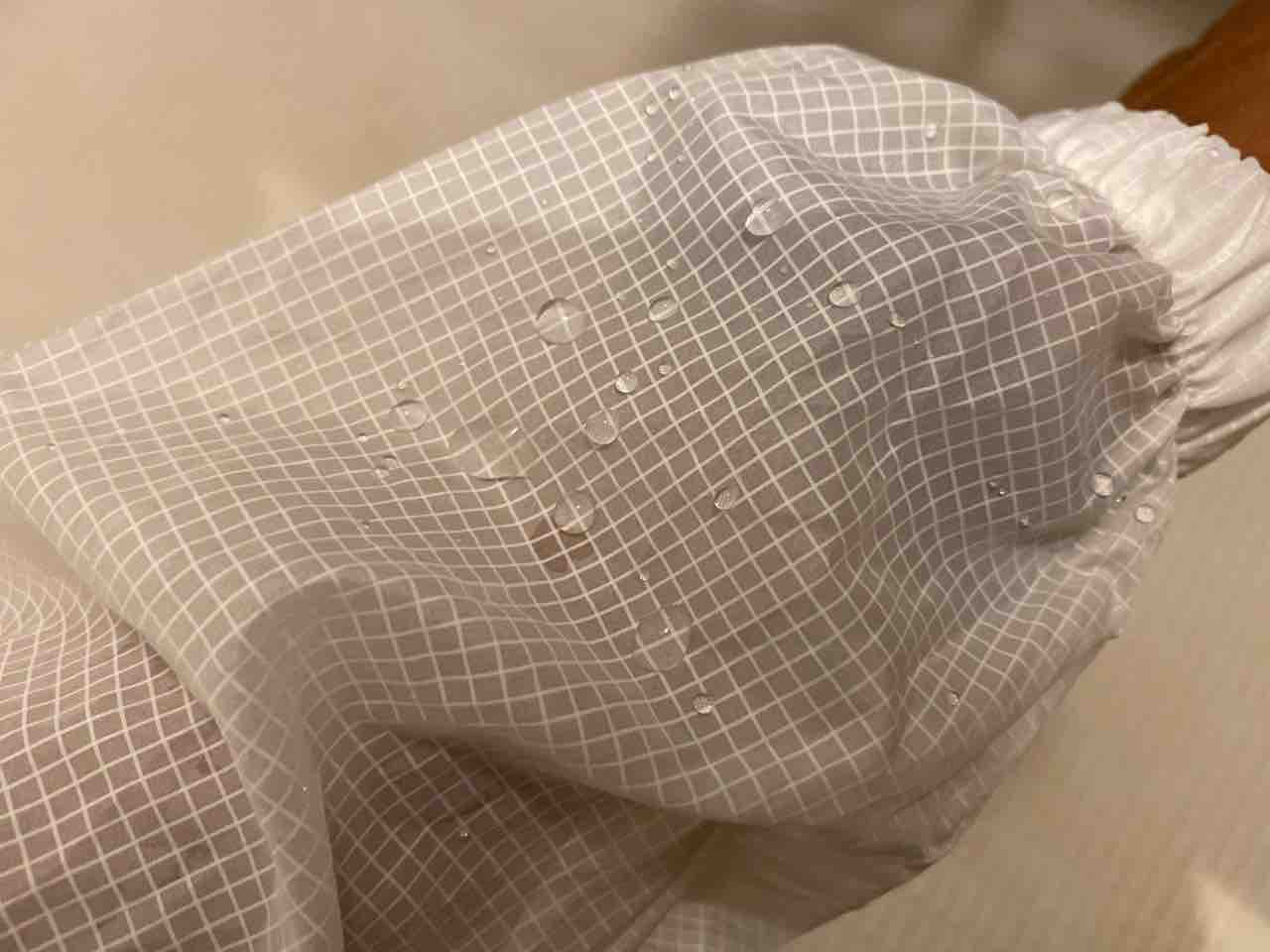 ところが、袖口構造としては保水しそうなのだが、生地自体の撥水性はかなり高いので、容易には水は溜まらないと思われる。