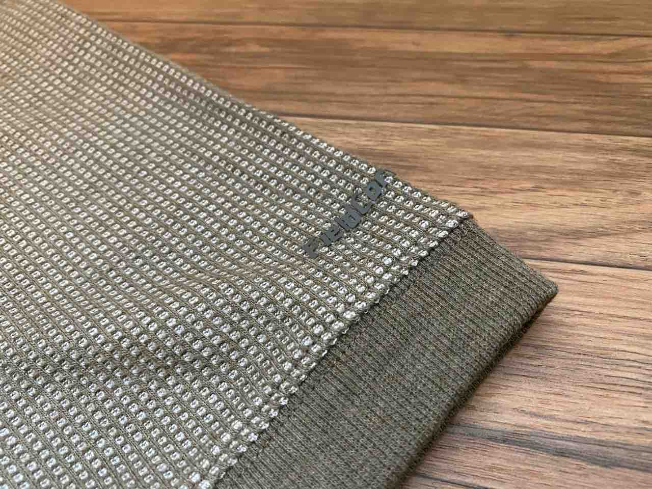 ワッフル状の凹凸がある生地のため、肌にペッタリと付きにくい。肌と生地に隙間があるので、ゆったりとしたシルエットと相まって空気が通りやすいというわけだ。