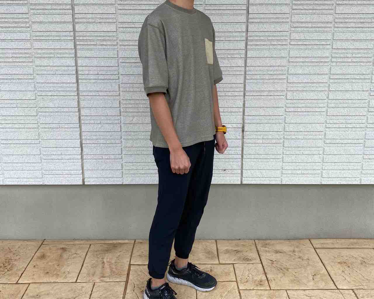 最初着たとき、おっ、サイズ間違えたか?と思ったがそうではない。袖は長く、五分丈くらい。どうやら今流行りのオーバーサイズってやつらしい。ちなみに175cm、Mサイズ着用。