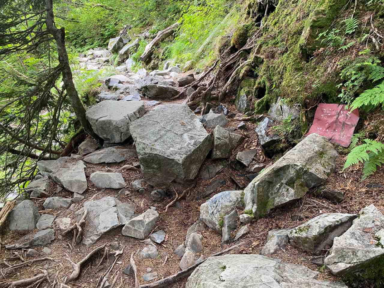 実際のthe日本の登山道はこんな風に石と木の根が跋扈している。これもトレイルだろうけど、トレイルランニングのトレイルとしては適していないと個人的には思う。