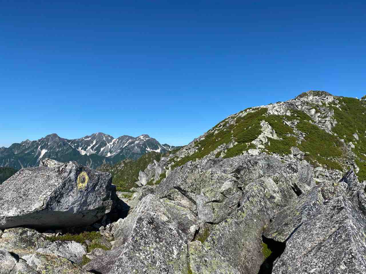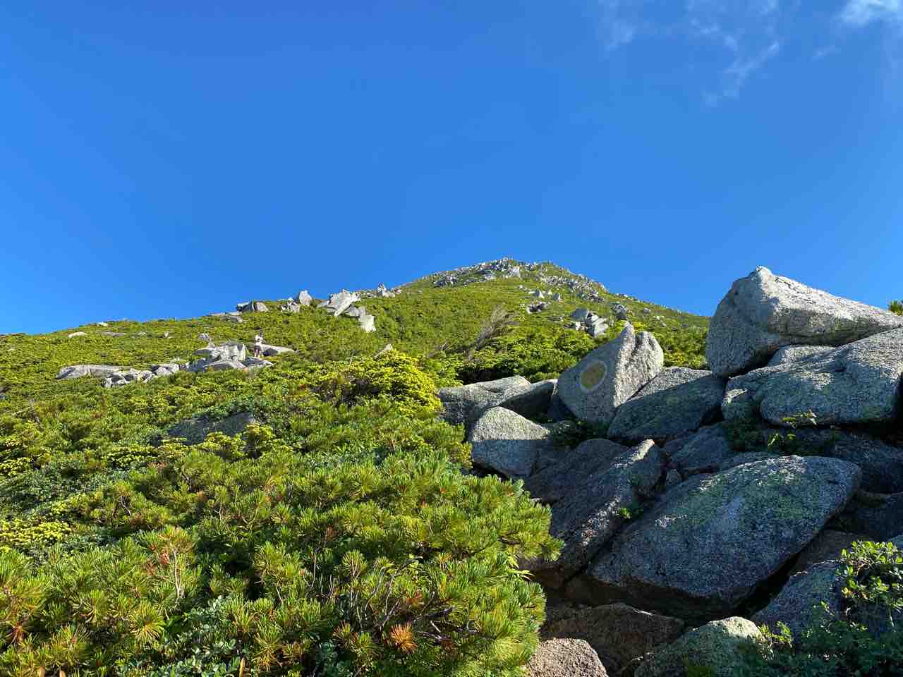 森林限界を越えても蝶ヶ岳のようななだらかな場所は稀で、巨石、巨岩の合間をすり抜けるようにルートがある。これもトレイルなんだけど、クライミング要素が多く、いわゆるランニングにはどちらかというと不向き。