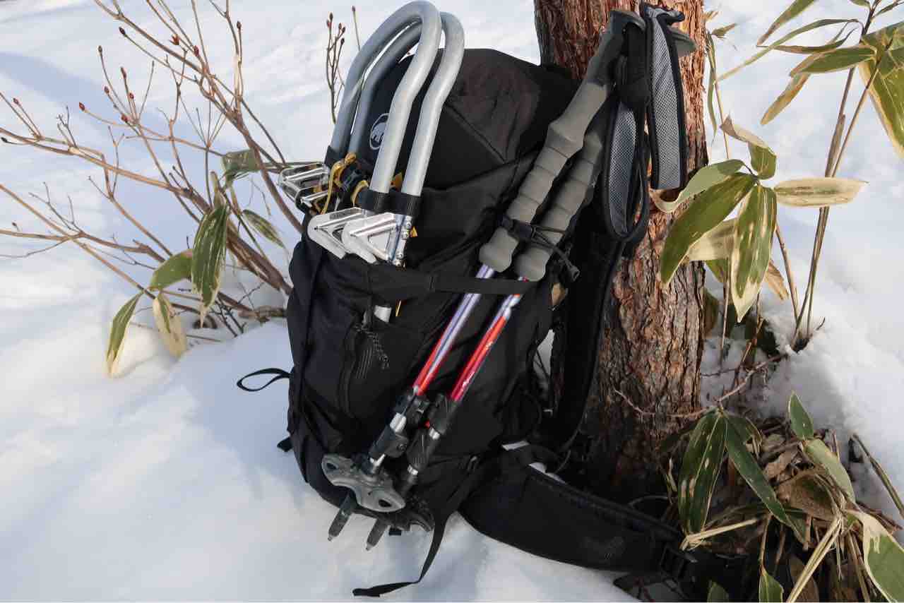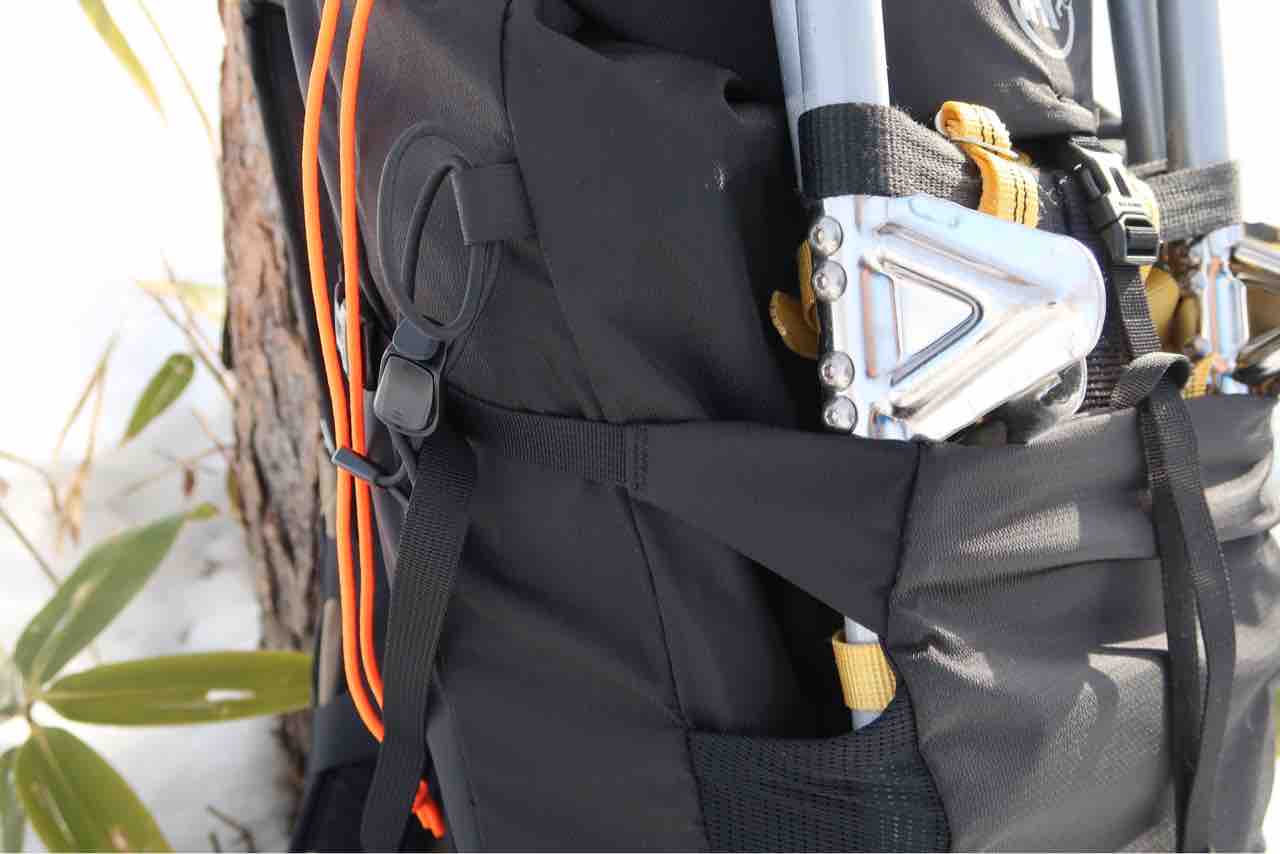 ストックもこのように外付けできるし、ピッケルも外付けできる。ザック下部にはピッケルのピックを通すスリーブもついている。