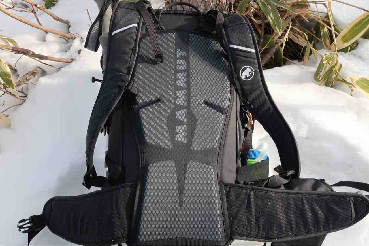 他社30リットルのザックと同様にフロントポケットがついている。リチウムのいいところはこのポケットがストレッチメッシュじゃなくてナイロンになっている点だ。全面メッシュだとアイゼンやスノーシューなどのギア類を入れたときに強度面で不安がある。