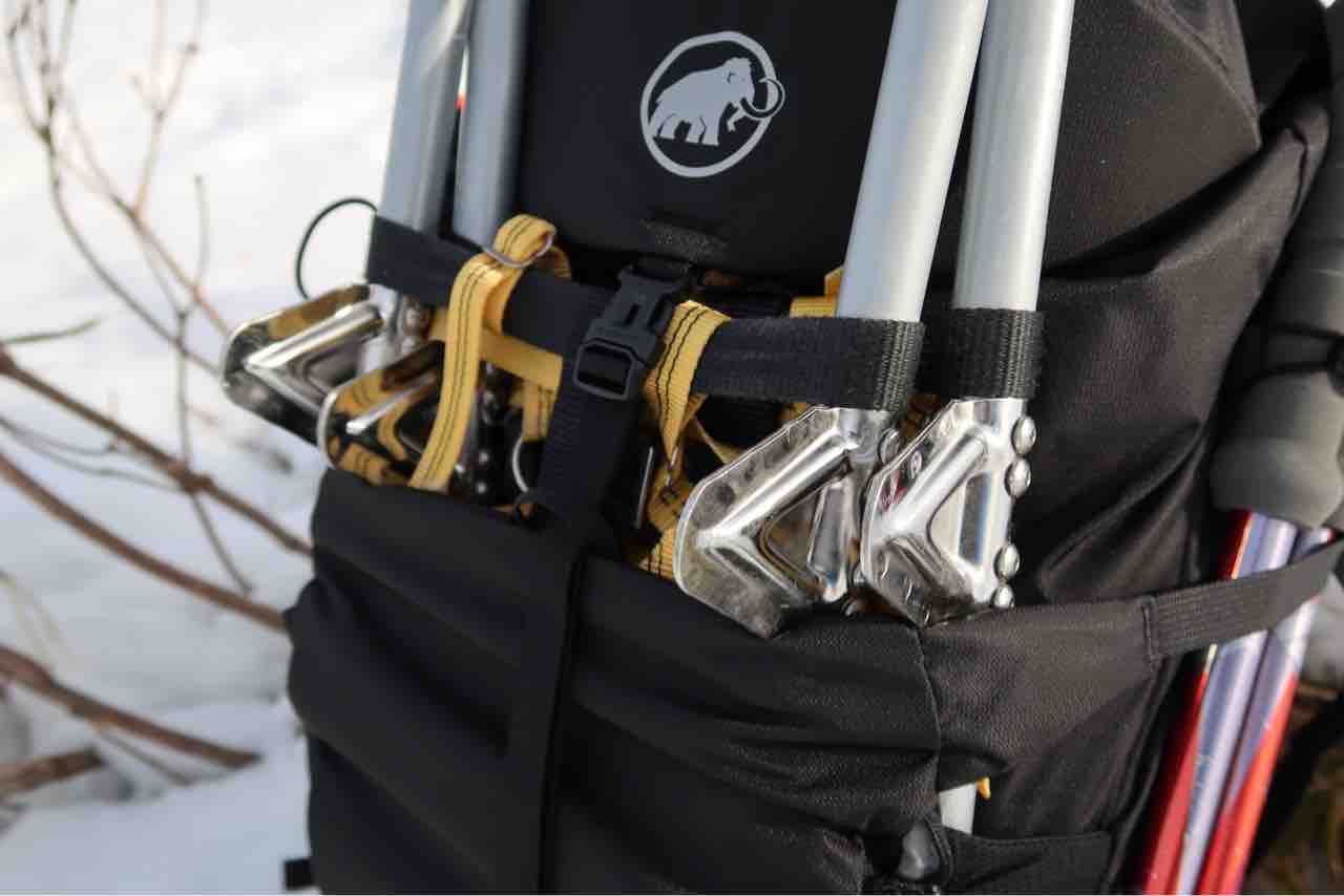 トップリッド(雨蓋)が一本締めであることも、フロントポケットの扱いの良さを向上させている。一本締めなのでワカンなどを入れても干渉せずにしっかり固定できる。外付けしてもとても安定感がある。