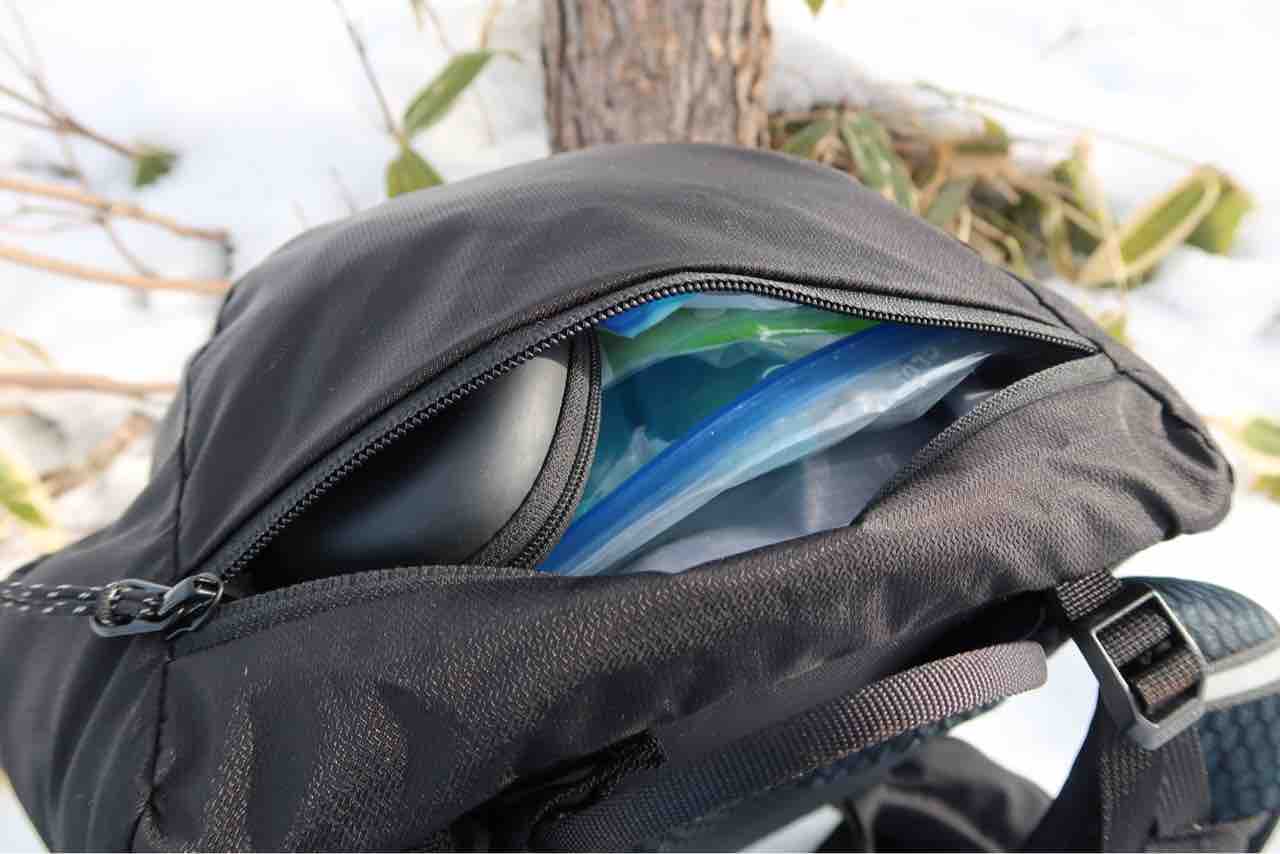 フロントポケットのサイドがコンプレッションベルトと一体になっている。バックルをリリースすれば大きめのスノーギアも現場でスピーディに出し入れできるのが嬉しい。サイドのストレッチメッシュがマチの役割を果たしている。