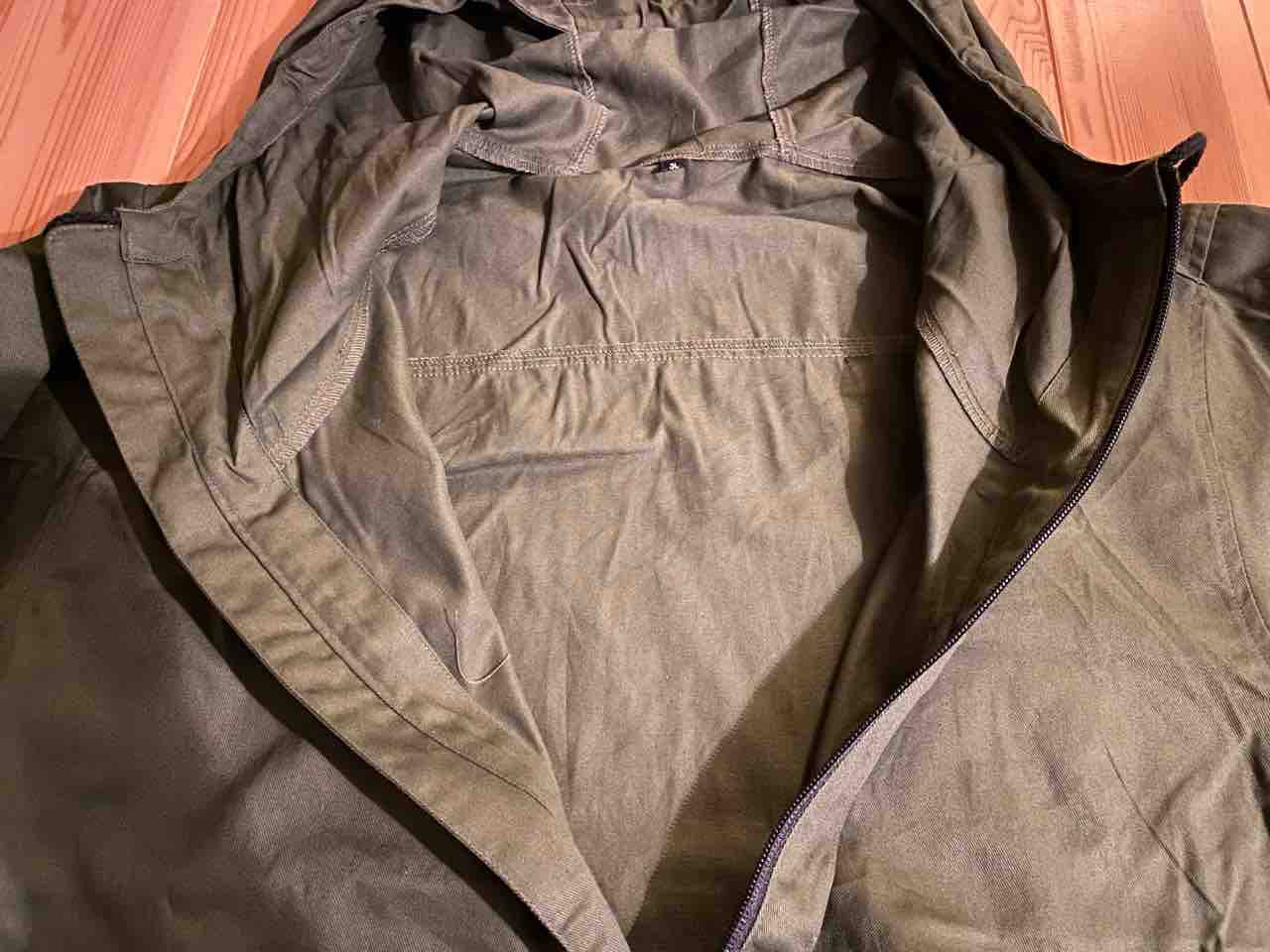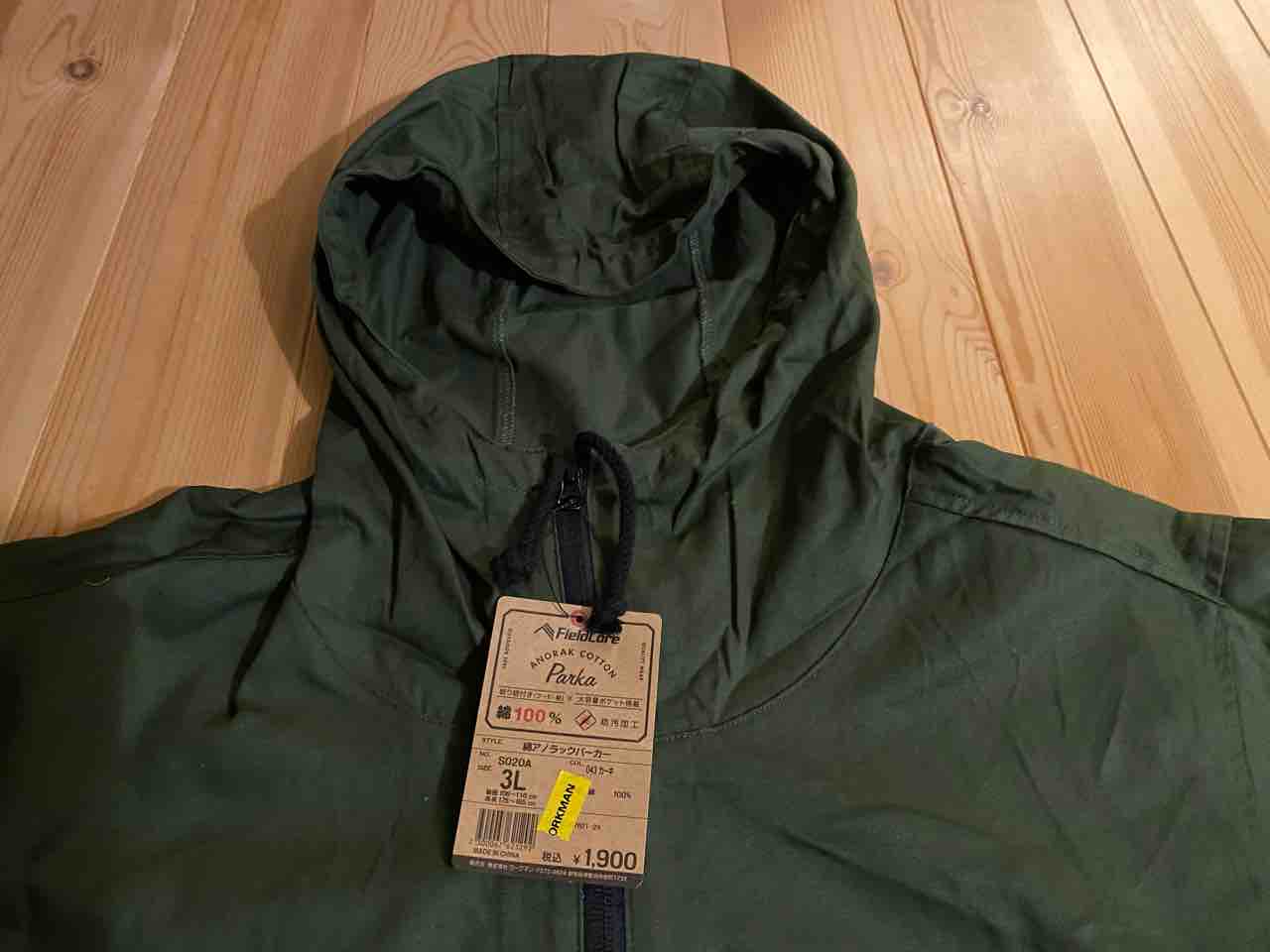 焚き火の火の粉や匂いを気にしなくていいようにナイロンフリースやダウンジャケットの上から被れる綿アノラック(1,900円税込)を購入!