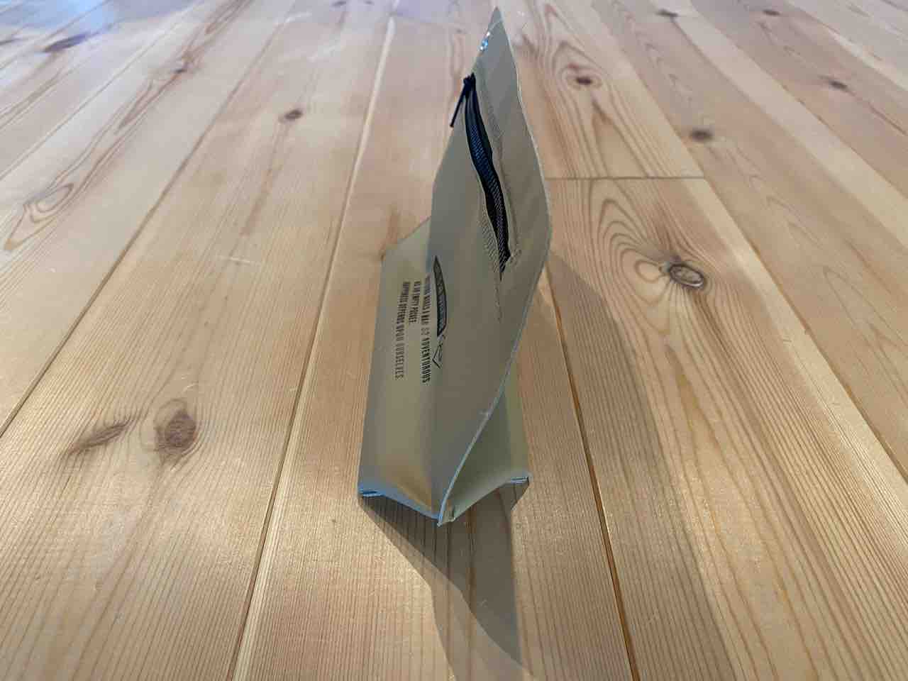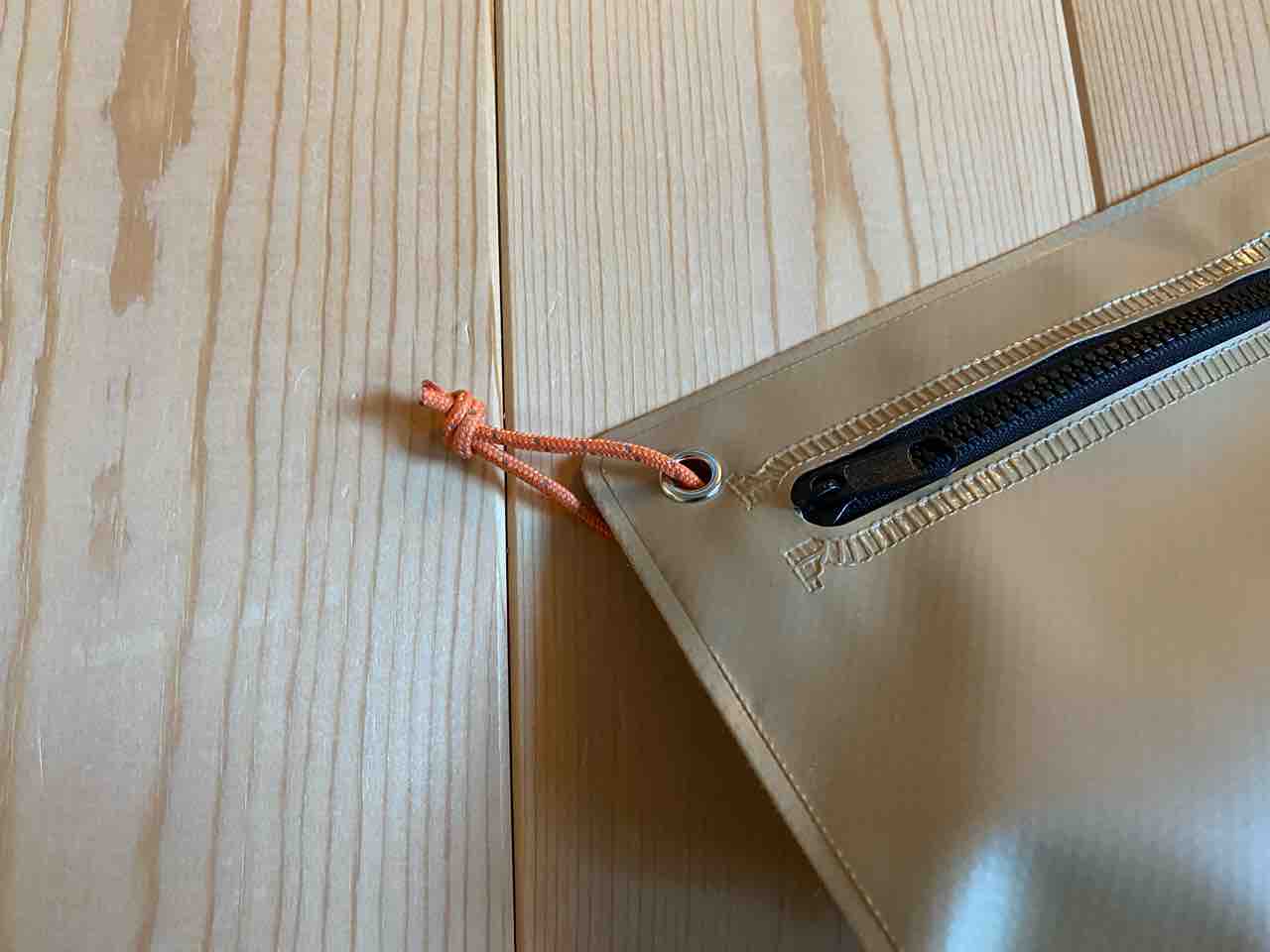 シリコンのポーチは無かったが、なにやら防水っぽい塩化ビニルのポーチを発見。ターポリンのような素材で開口部はジッパー。これは携帯ゴミ箱として使えるのでは?