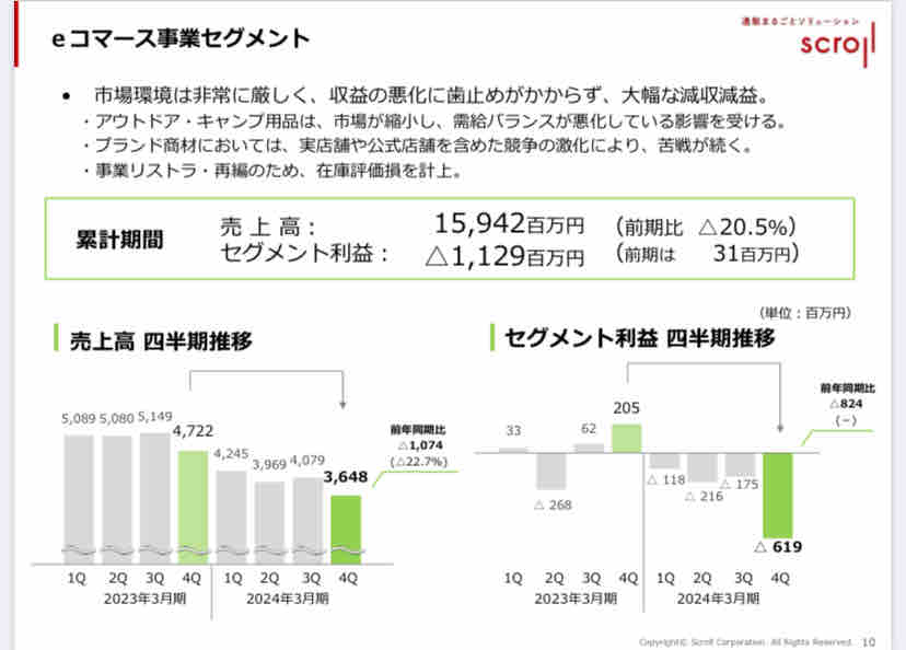 キャンプ市場が危ういということについて、株式会社スクロール(アウトドア用品EC大手のナチュラムの親会社)が決算報告にこんなこと書いている。(株式会社スクロール 2024年3月期 決算説明より)