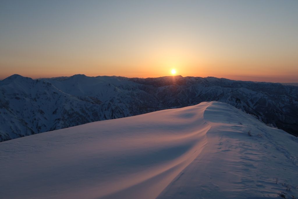 テントの設営が完了したら、ちょうど息を飲むほどの美しい夕日が苗場山の上あたりに落ちていくところでした。