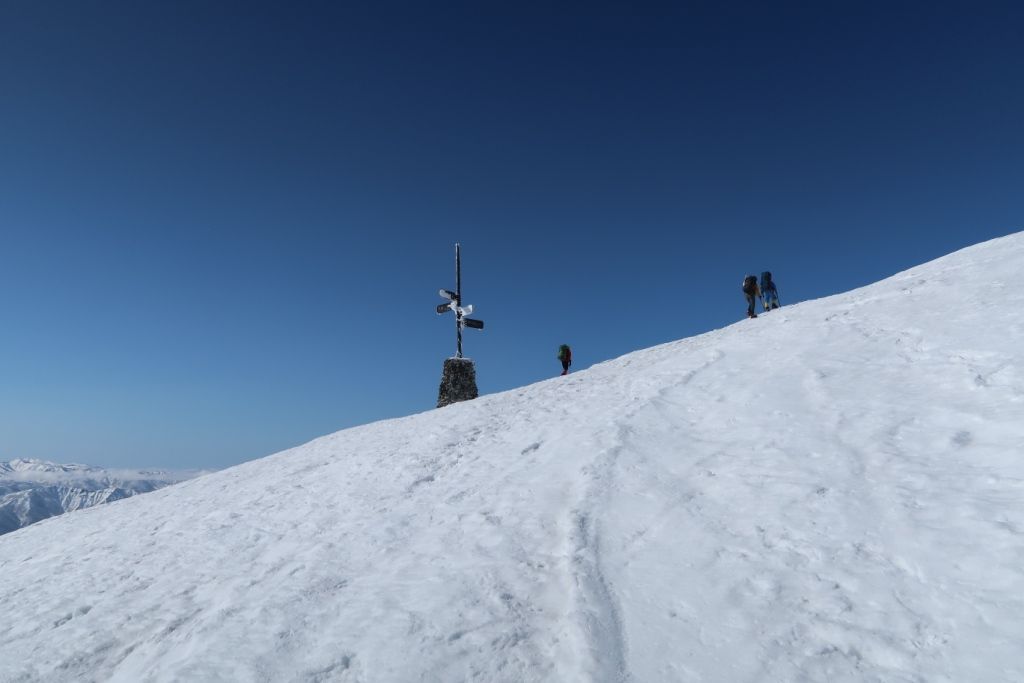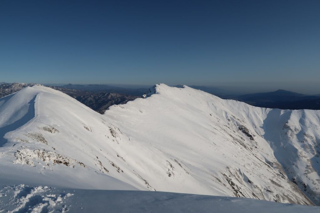 オキの耳から按部まで下り、一ノ倉岳を登り返すとなだからな稜線づたいに茂倉岳まで歩きます。もはや道標は雪の中に埋まっているので山頂がどこだがよくわかりませんが、一番高いところが山頂なのでしょう。