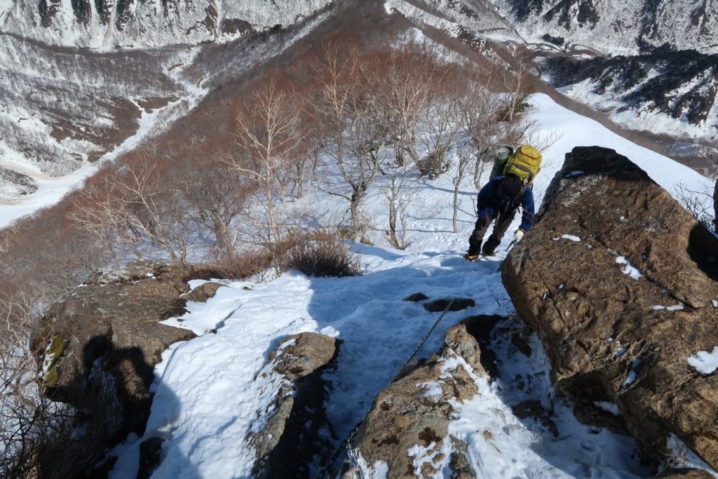 ザンゲ岩のあたり、鎖場があり、岩の隙間の雪が凍結しているので注意が必要です。我々はここの手前からアイゼン、ピッケル装備にしました。