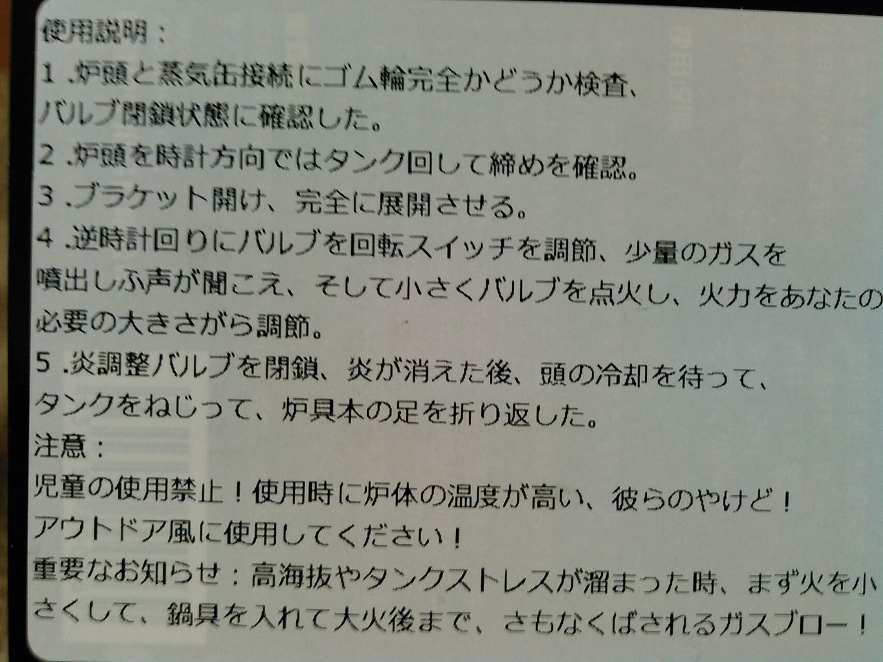 この中国製バーナーは検査協会の検品済マークを取得してないので検査は受けていないことになる。なので、一酸化炭素(CO)の濃度や周辺温度など、いつくかの面で日本の基準をクリアしていないので日本で発売されている他のブランドと同様に扱うと、もしかしたら危険な目に遭うかもしれない。